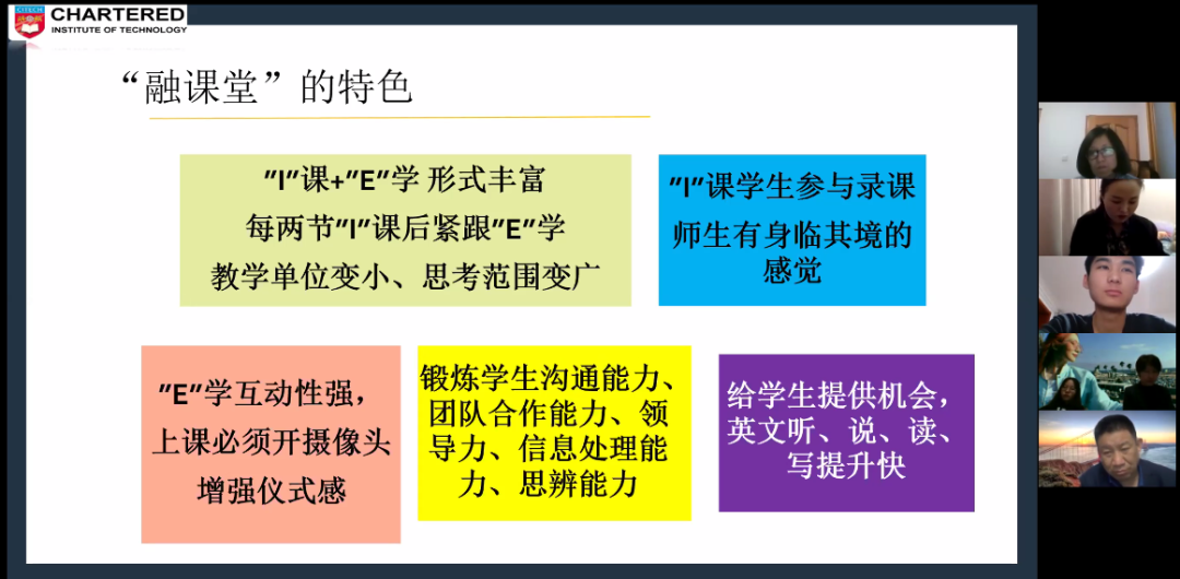 “I”课学生参与录课,让师生交流互动赋有身临其境的感觉;“E”学互动性强,规定上课必须开摄像头,以增强仪式感,同时锻炼学生沟通能力、团队合作能力、领导力、信息处理能力、思辨能力,给学生提供更多展现的机会。