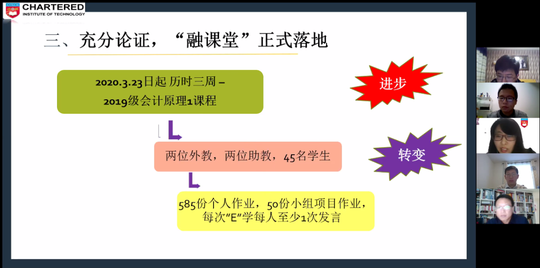 新冠疫情的蔓延,使得国际商学院外教课程的实施受到了冲击,外教无法赴现场进行教学。为了确保外教课程保质、保量地顺利开展,国际商学院深入探讨了适合网络教学的混合教学方法,借鉴LSE等名校网络课程结构后,开创性的提出了“融课堂”模式。