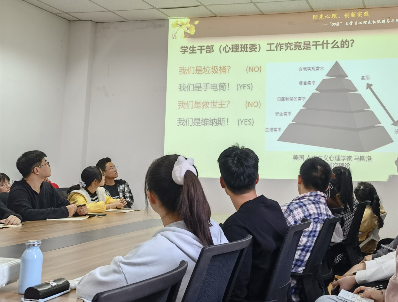 通过对美国人本主义心理学家马斯洛的需求层次理论解读,老师阐明了心理委员要立足角色定位,在开展班级心理工作时应努力成为同学们的“手电筒”、“维纳斯”等角色,而不仅仅是倾诉的“垃圾桶”。