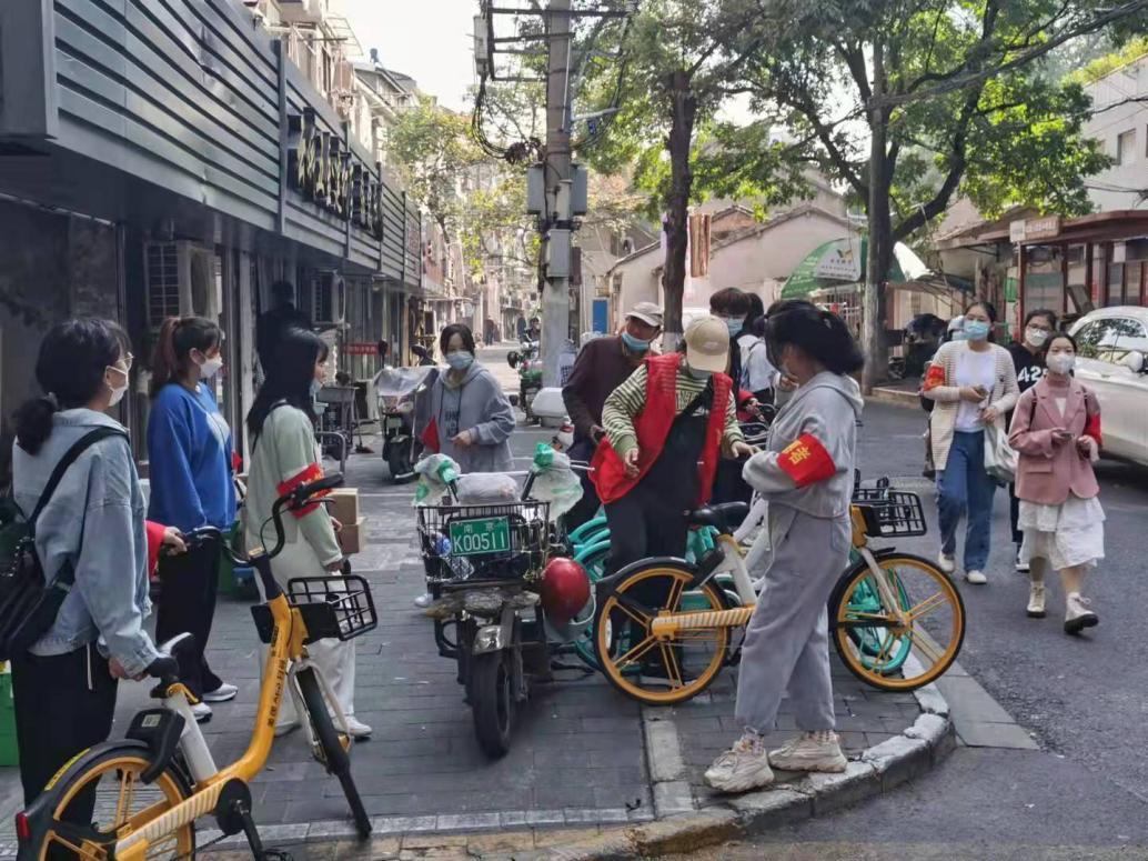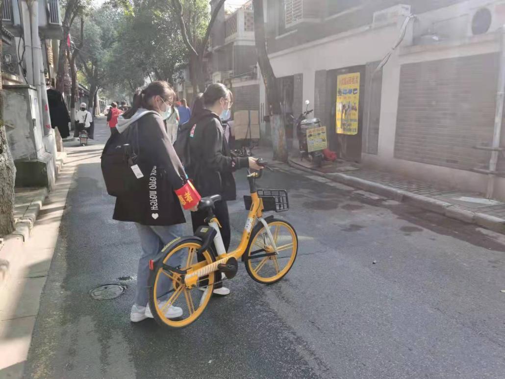 上午,根据社区安排,同学们来到玄武区老小区进行共享单车的整理志愿活动。玄武区是南京老城区之一,共享单车的乱停乱放问题比较严重,影响着区域整体环境和群众生活感受。受玄武区梅园新村社区党群服务中心的工作人员的邀请,志工部的同学们帮助社区进行共享单车规范停放的志愿活动。