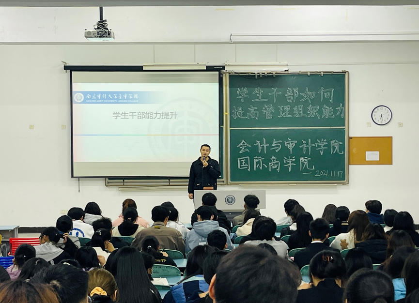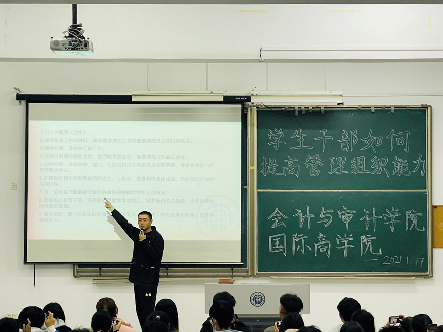 为了规范学生干部行为,提高学生干部工作的热情和信心,国际商学院、会计与审计学院于2021年11月17日晚在B南208阶梯教室召开“学生干部如何提高管理组织能力”讲座。本次讲座特邀国际商学院分团委学生会书记马浩杰担任主讲老师,参加此次会议的有2021级全体班委和两学院团学干部。