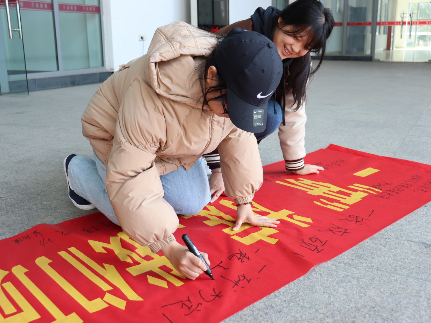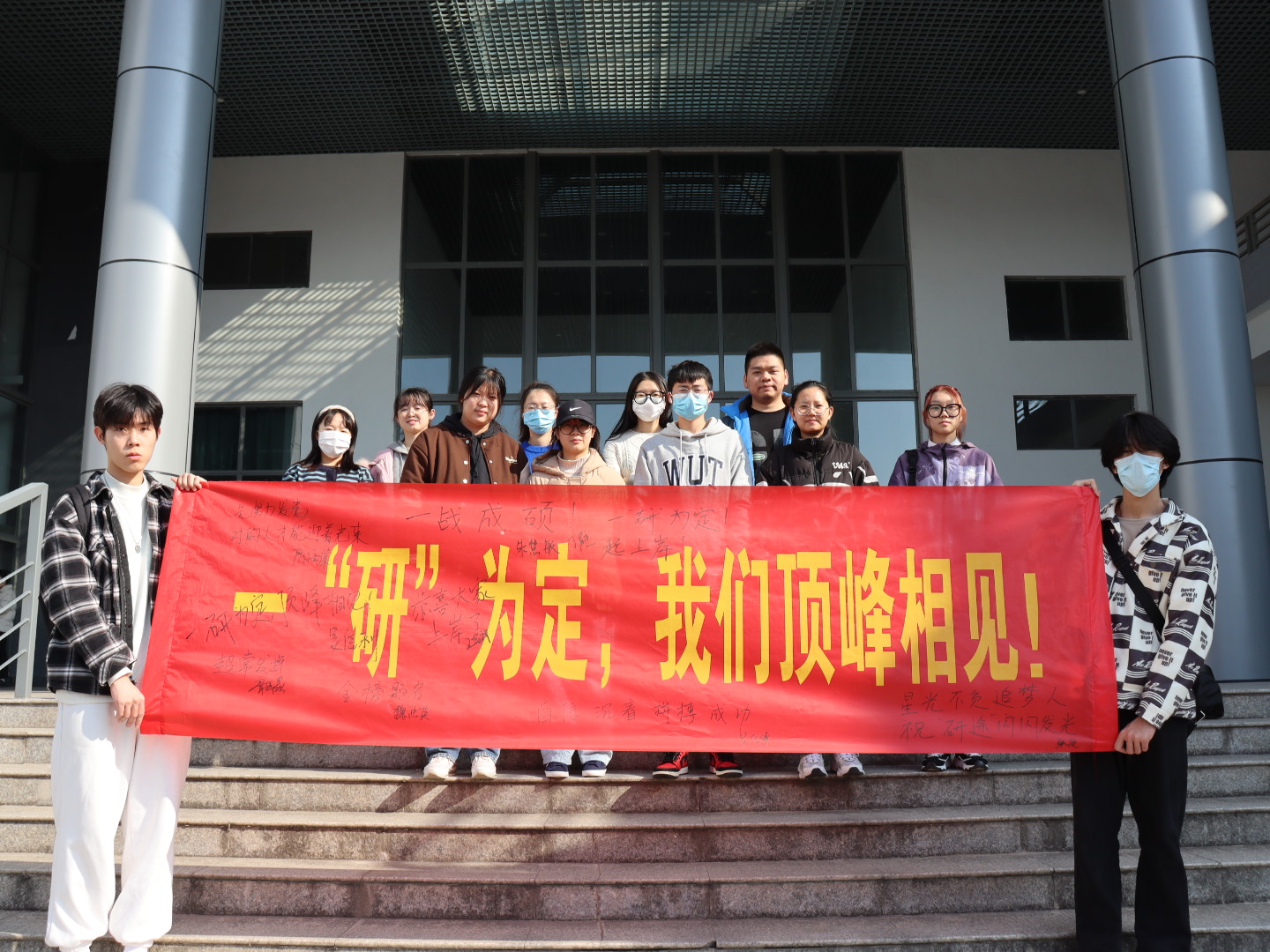 会计与审计学院、国际商学院的同学们在“一‘研’为定,我们顶峰相见!”的横幅上写下自己对各位师兄师姐的祝福。