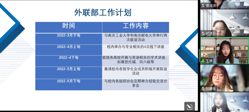 随着新学期的开始,2022年2月23日晚,William威廉英国国际商学院分团委学生会召开本学期第一次工作计划汇报。本次会议由学生会执行主席主持,六位主席团成员分别对自己分管的部门做工作汇报。