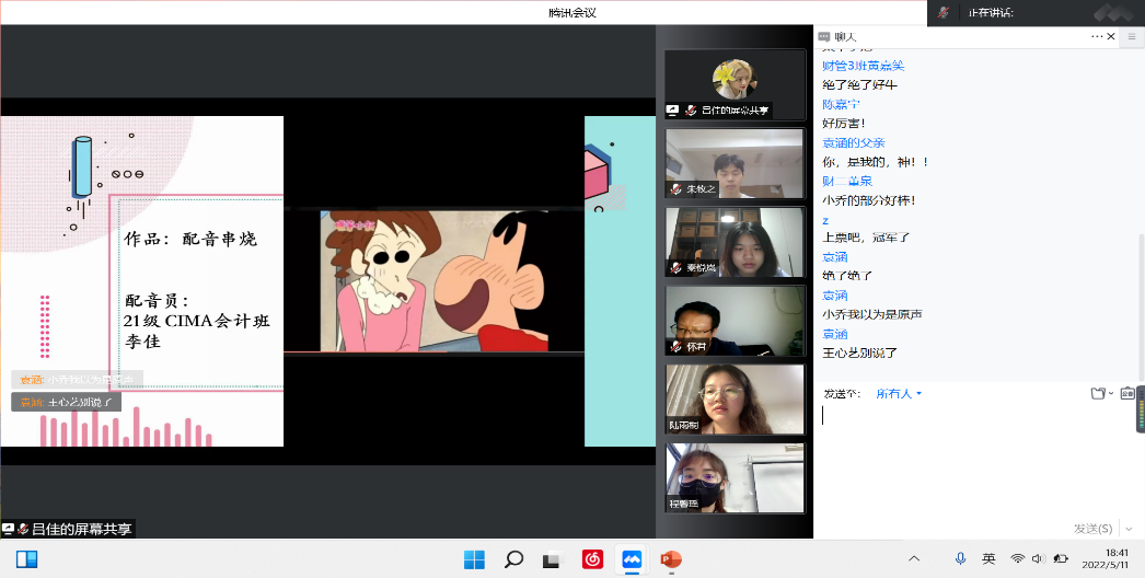 为了丰富校园文化生活,展示当代大学生风采,提高大学生的口语表达和交际能力。2022年5月11日晚,国际商学院在线上腾讯会议举办了这次“声”采飞扬影视作品配音大赛。在疫情这样一个特殊时期,影视作品配音大赛给同学们的身心带来了愉悦的体验,也在一定程度上缓解了同学们学期期末复习备考紧张的心情,起到了寓教于乐的良好效果。