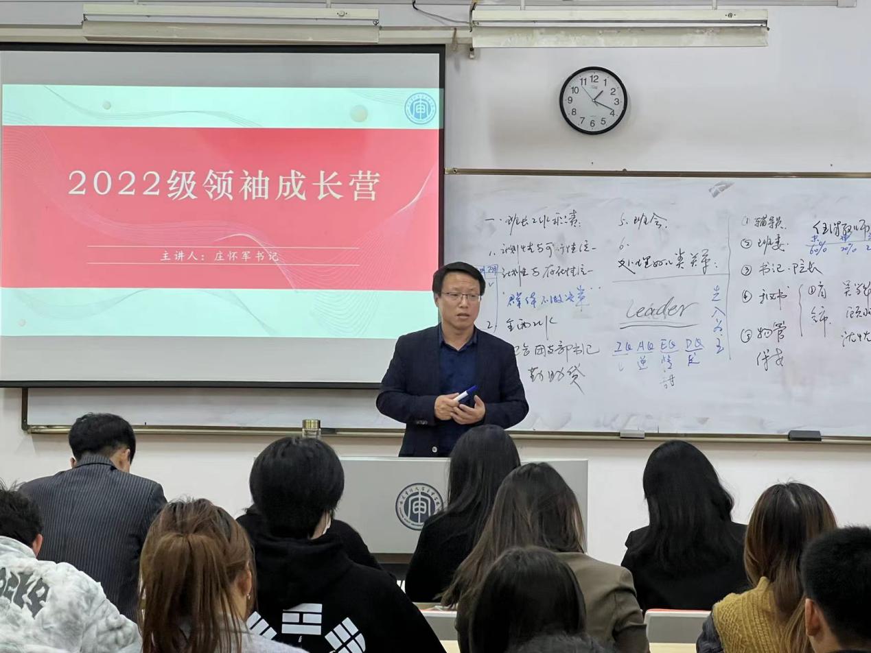 班长是辅导员的得力助手,是学院和班级之间的桥梁和纽带。为充分发挥班干部的作用,提高班集体凝聚力,培养优秀的班集体,创建优良的班风。2022年10月25日下午,2022级领袖成长营在B北503教室正式拉开帷幕。会计与审计学院(国际商学院)党总支书记庄怀军以“大学班长应如何开展学生工作”为主题进行了一系列指导性讲话,参会学生包括会计与审计学院(国际商学院)分团委学生会副书记和主席团成员以及2022级全体班长。