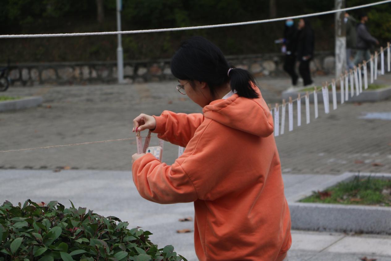 此外,令人难忘的是每个同学在捐完书籍之后都会在明信片上给孩子们写下寄语,每一份明信片上都写着同学们对孩子们的美好祝愿,这些明信片都会被挂起来,随风飘动,熠熠生辉,形成了金审校园里一处独特的风景。