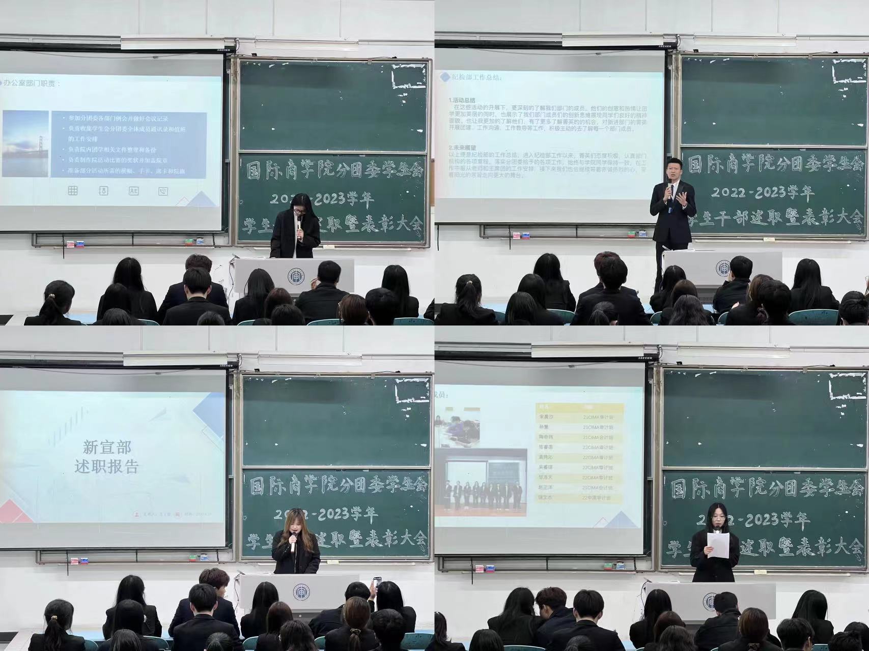 大会上各部门部长依次上台进行述职。每位学生干部都秉持着严谨认真的态度,细致地阐述各部门的主要职责,以及在任职期间带领部门做出的贡献。并以此为新起点,坚持认真的工作态度,再接再厉。