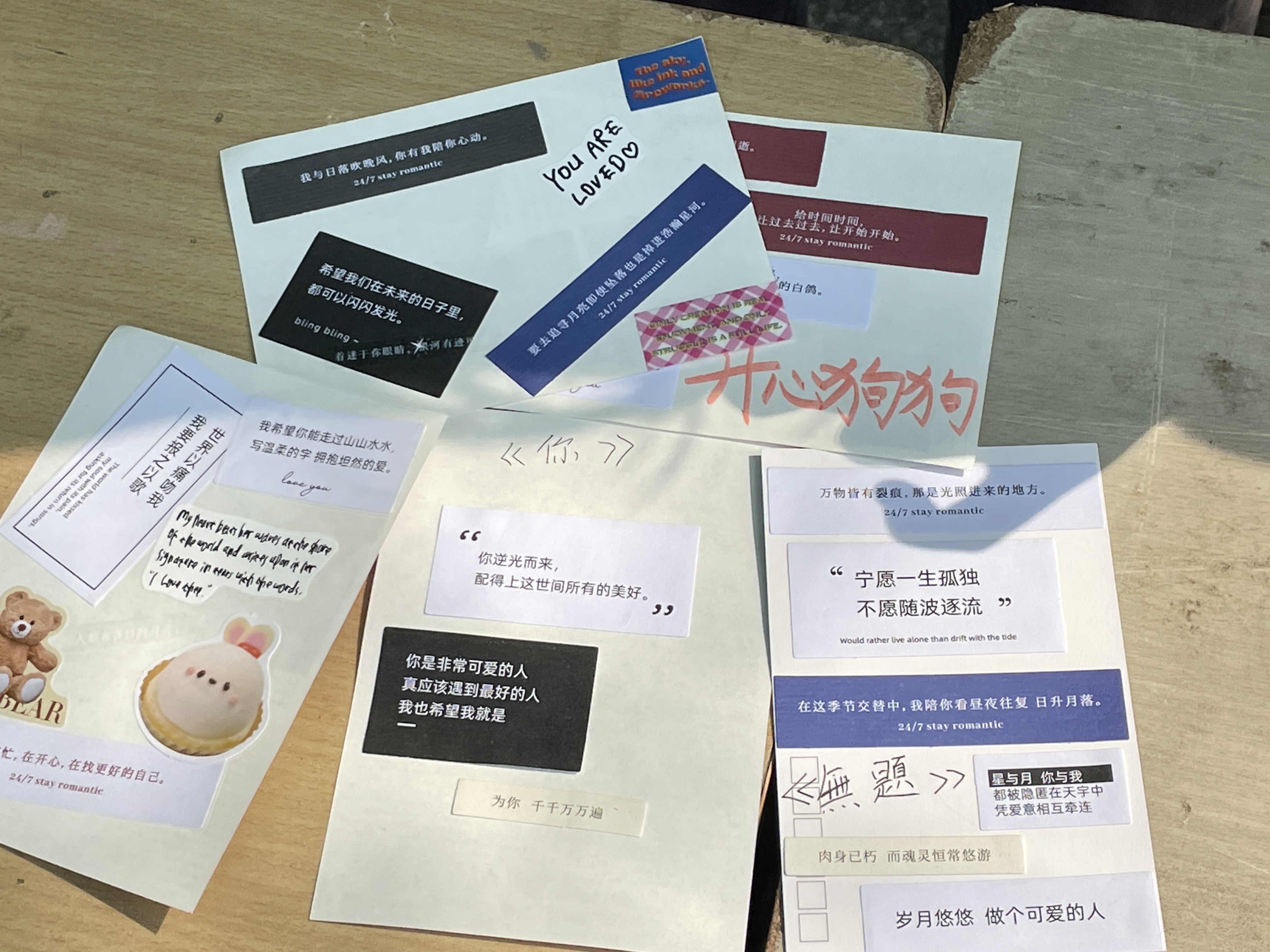 冬去春来,在这万物复苏、春暖花开之际,石头广场的拼贴诗摊位吸引了许多同学的目光。此次活动采用现场创作的形式,同学们利用提供的词条碎片,在现场拼贴出一首独一无二的诗歌,用诗句打破刻板印象的壁垒,碰撞出属于自己的小世界。一张张独一无二的小卡片,在和煦的春光中闪耀着独特的光芒。
