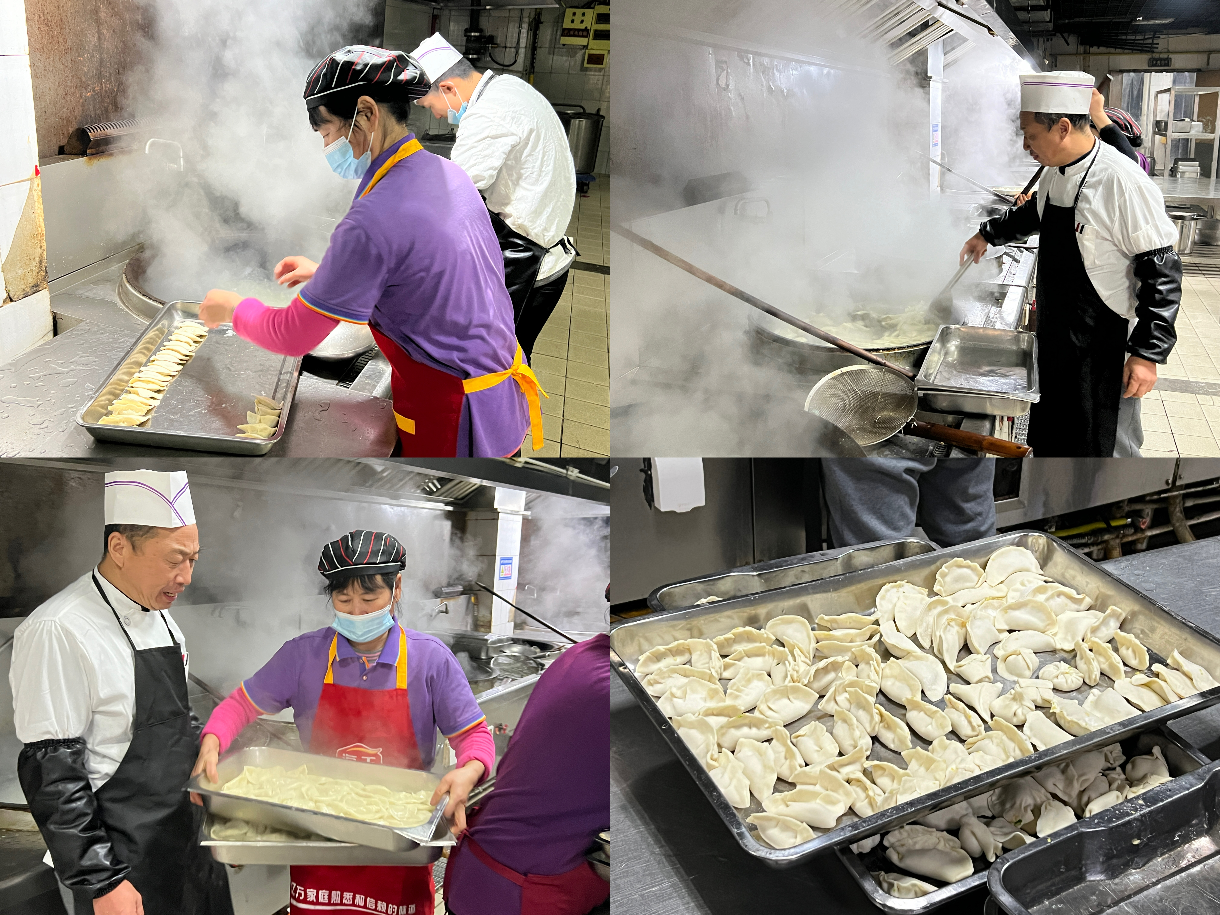 各组的饺子陆续完成,在食堂的工作人员的帮助下,承载期许的饺子翻腾入锅。伴随厨师铁勺的搅动,蒸腾的热气氤氲着饺子的清香。起锅后,冒着热气软软弹弹的饺子就端上了餐桌。