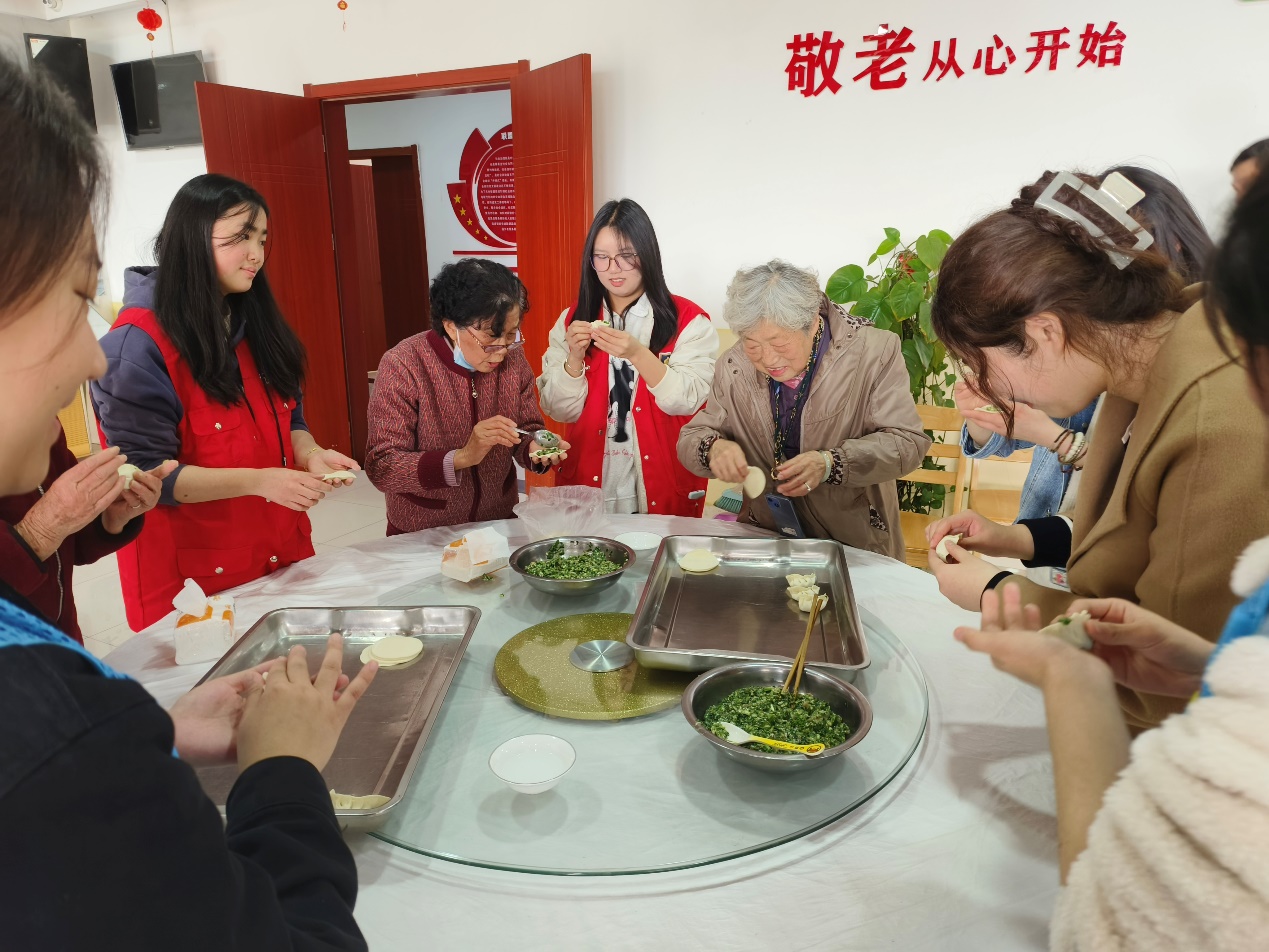 热闹过后,志愿者们与老人们一起动手包起了饺子。包饺子手艺娴熟的老人们手把手指导着志愿者们,场面温馨满满,大家的脸上都洋溢着笑容,仿佛温暖的大家庭。