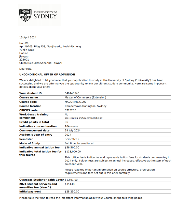悉尼大学offer(QS19)