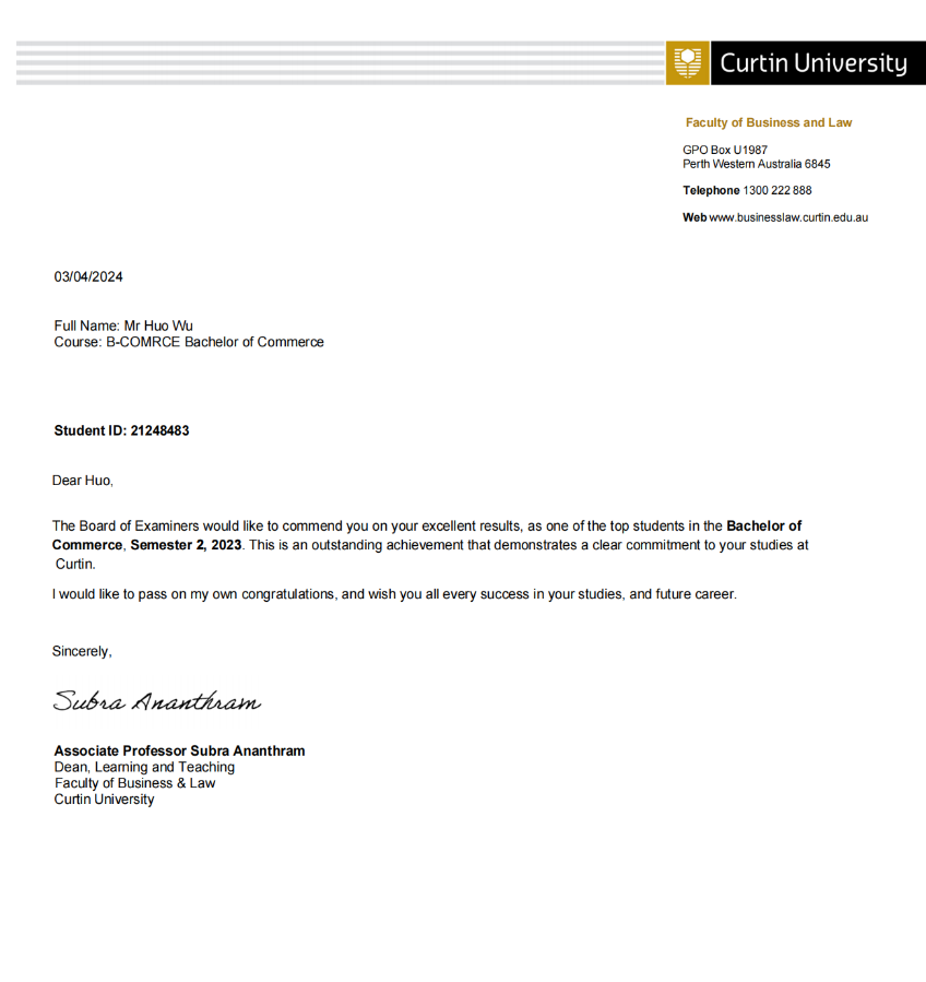 在四年的大学学习中,吴惑始终以学习为主要任务,专注于专业知识的学习。在金审学院的三年学习中,平均成绩3.79始终位列班级第一。在科廷大学的学习中,吴惑同学依旧保持对学习的认真态度,多次获得校级表扬信。在校期间,专注于职业素养的培养,在无免试的情况下通过ACCA国际注册会计师9门考试。目前,吴惑同学已获得悉尼大学、新南威尔士大学等心仪大学的offer。