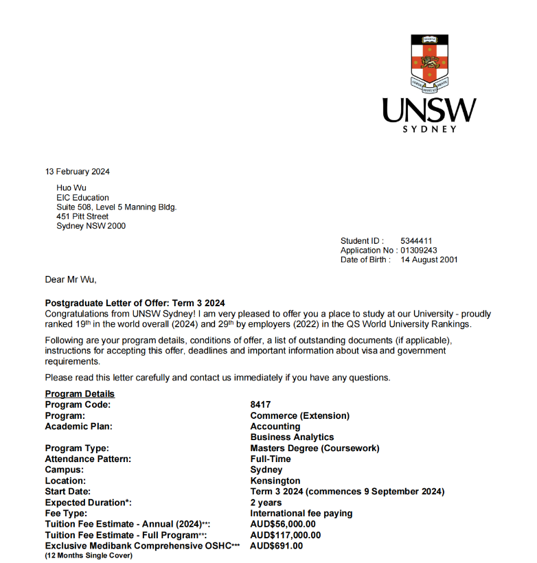 新南威尔士大学offer(QS19)
