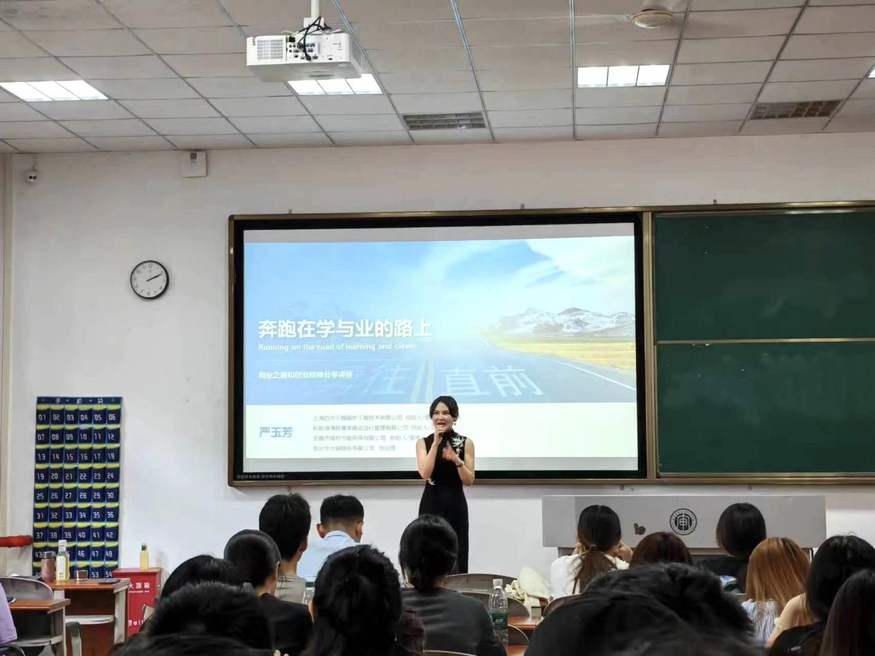 严玉芳女士毕业于苏州大学电气工程及其自动化专业,创办了无锡市锡羚节能环保有限公司和上海四方无锡锅炉工程有限公司,全资收购了东台华光钢格板有限公司,并于2024年成立科龄诗净肤美学商业运行管理有限公司,同时也是CGMA资深会员。严女士依次讲述了自己的大学生活、打工经历、事业的发展历程,并与同学们分享创业心得。她认为采取老老实实的态度,打好自己的根基,才能保证稳当,不出纰漏、不走歧路。