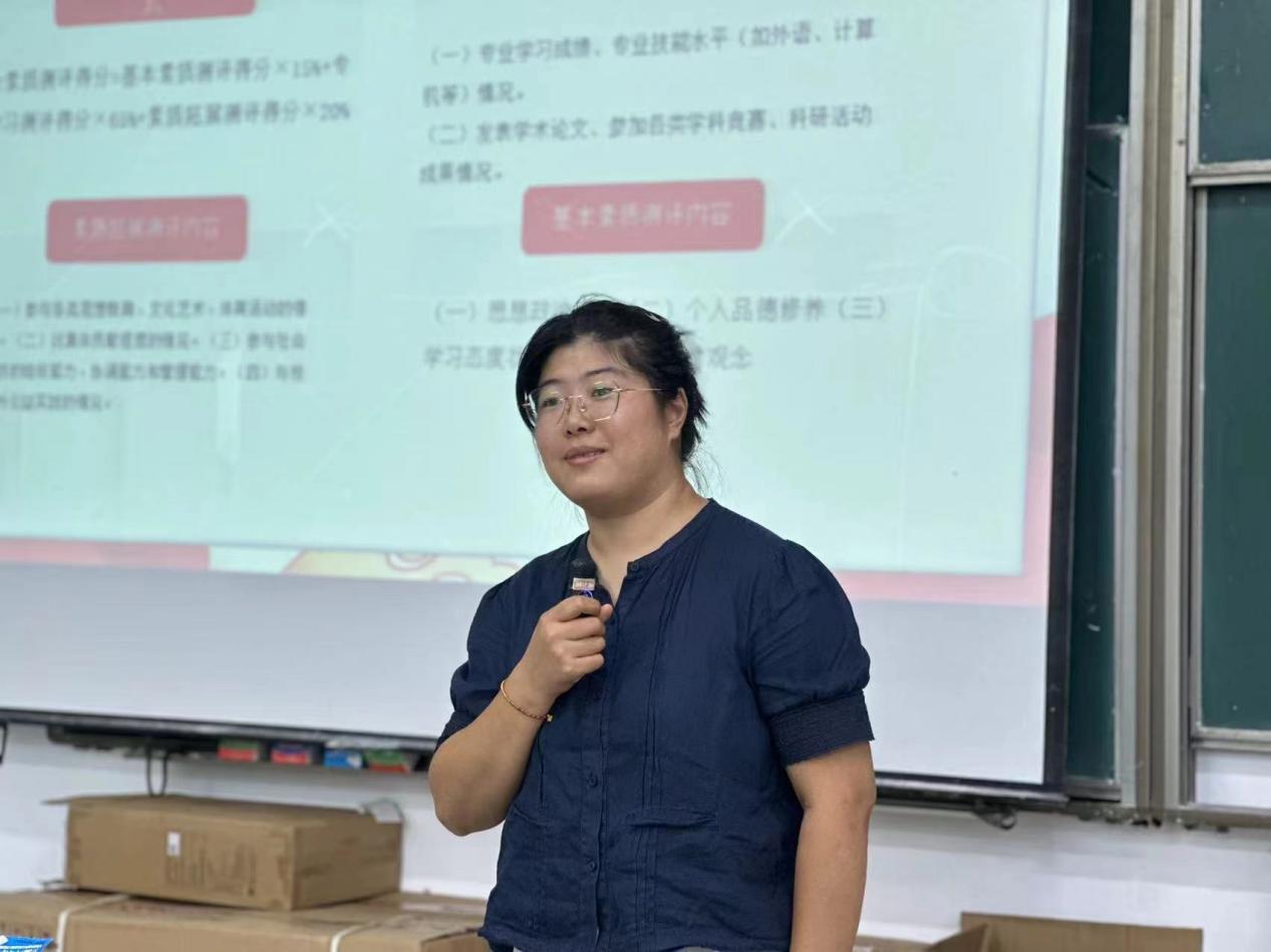 于青秀老师首先提出一个问题——为什么要评优?并为这个问题作出解答。于老师介绍各类奖学金的种类,包括国家奖学金、国家励志奖学金、学校奖学金等,详细讲解奖学金的评选标准,如学习成绩、综合素质和社会实践等方面的要求,强调奖学金对大学生的激励作用,鼓励学生努力学习,积极进取。