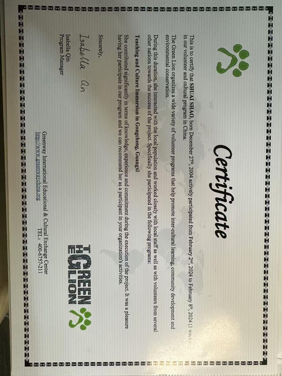 在大一的暑假,她加入了格林卫国际志愿者组织,前往广西桂林恭城瑶族自治县进行支援教学项目,帮助偏远地区的孩子们拓宽眼界,作为志愿者,她在此次活动中收获了珍贵的回忆和成长。在大一的寒假,她在中国邮政储蓄银行张家港分行进行了为期一个月的实习,在银行帮助大堂经理处理基本业务,在此次实习中,她受益匪浅。
