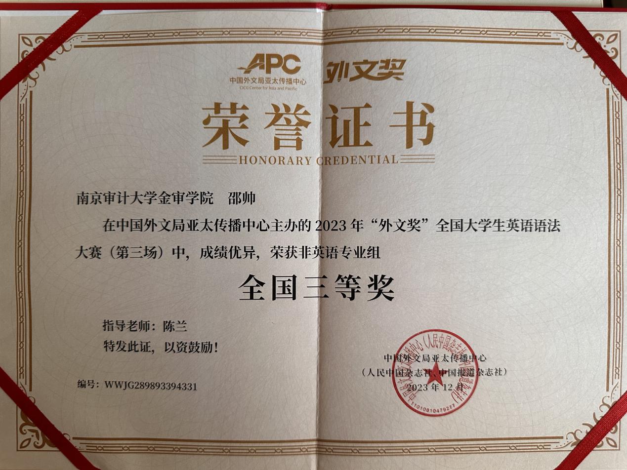 她也积极参加学校各项比赛并取得相应奖项,在2024CGMA商业精英国际挑战赛中国大陆半决赛中获得了全国优胜奖,全国大学生英语语法大赛中获得全国三等奖,ESG大学生创新挑战赛中校赛二等奖等奖项。