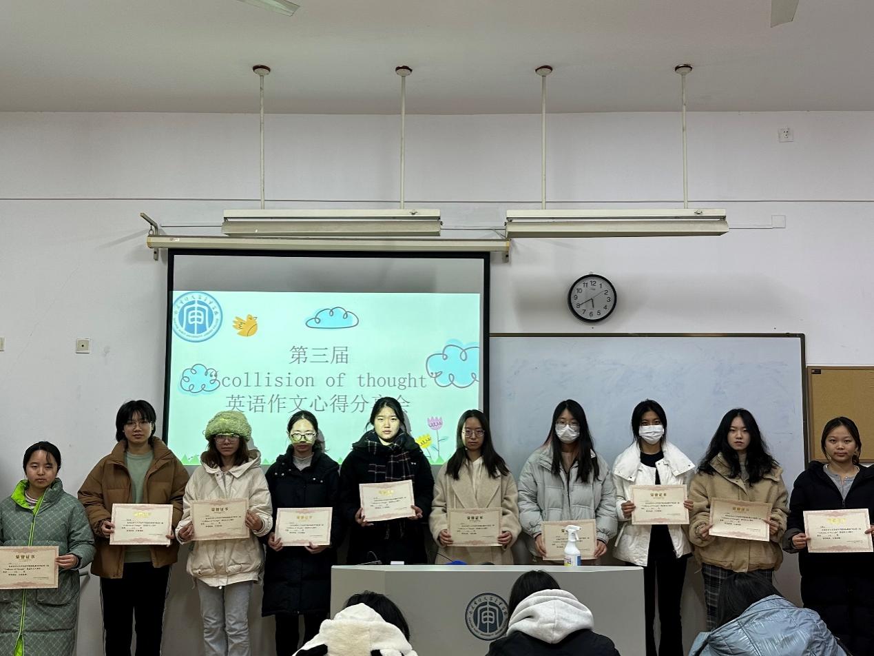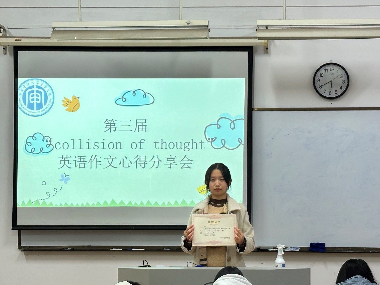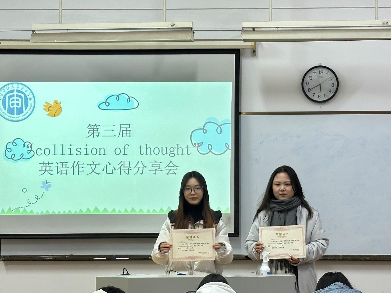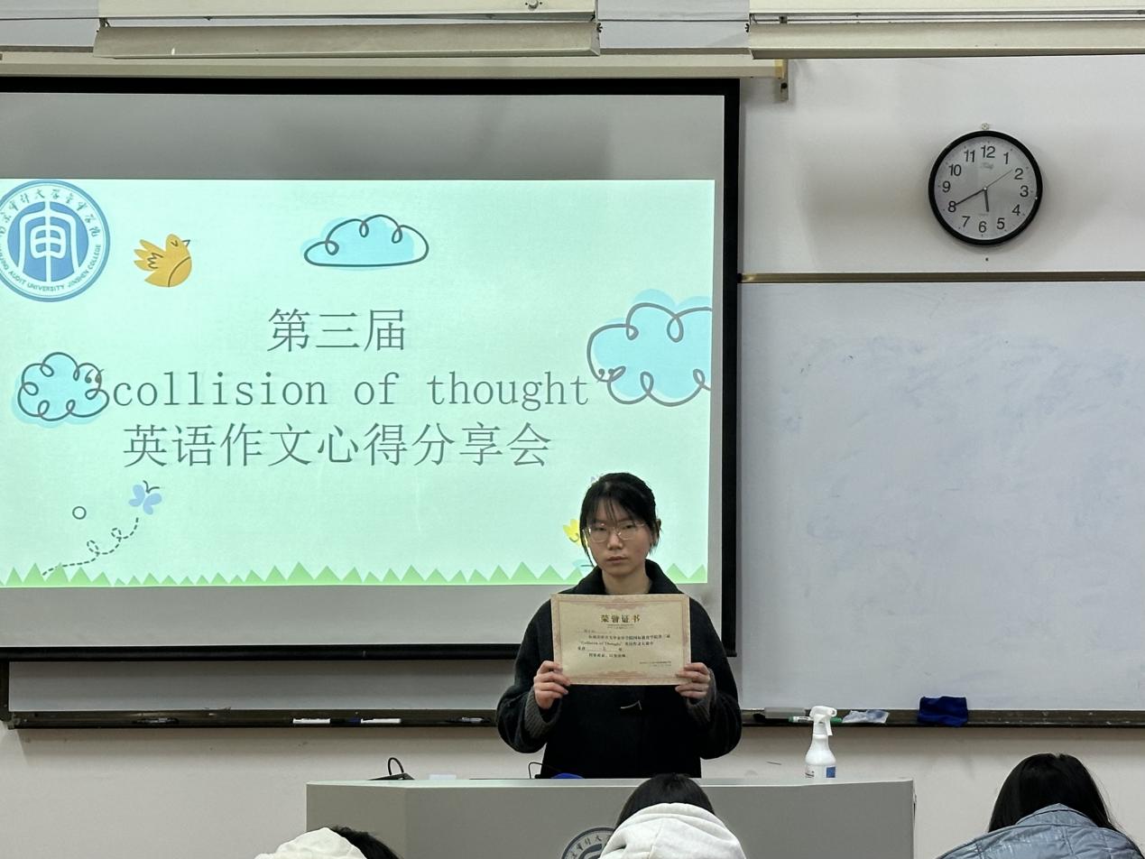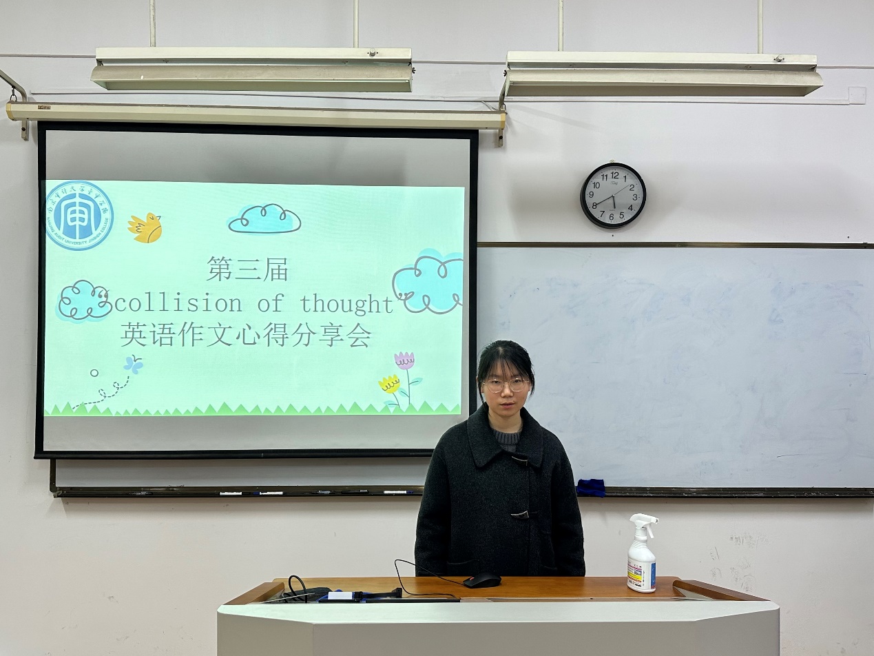 为了丰富校园文化生活,迎接即将到来的大学英语四、六级考试,锻炼在校大学生的英语能力,培养大学生学习英语的乐趣。12月9日晚,第三届“Collision of Thought”英语作文心得分享会于B北504展开。