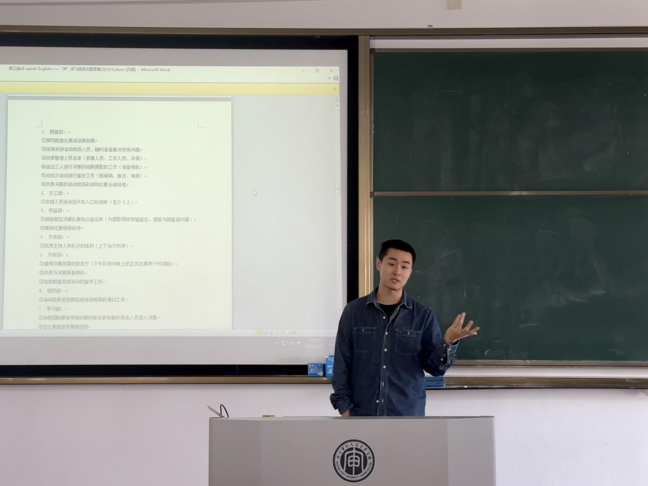 会上,马浩杰老师对大赛筹备工作进行部署,要求各部门各司其职、协同推进,确保赛事高效有序开展。会议特别强调细节把控与学生干部的模范作用:活动期间各部门菁英需佩戴工作牌,马老师强调:“大赛不仅是能力展示的平台,更是德育实践的窗口。学生干部需以身作则,兼顾学业与工作,保持优异成绩,展现全面素养。”