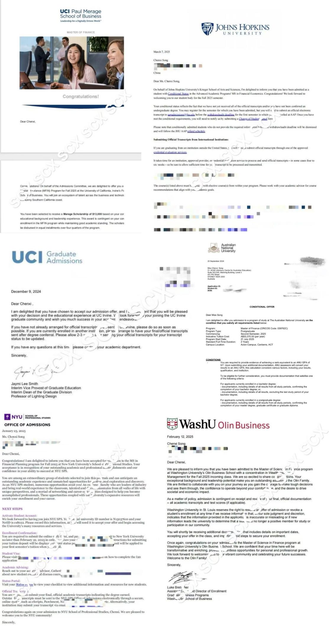 录取院校:美国加州大学尔湾分校金融学(1.3w美金奖学金+usnews33)、美国西北大学项目管理(usnews6)、约翰霍普金斯大学金融学和金融经济学(两个专业)(usnews6)、纽约大学金融规划(usnews30)、圣路易斯华盛顿大学金融学-财富与资产管理(usnews21)、澳洲国立大学金融学