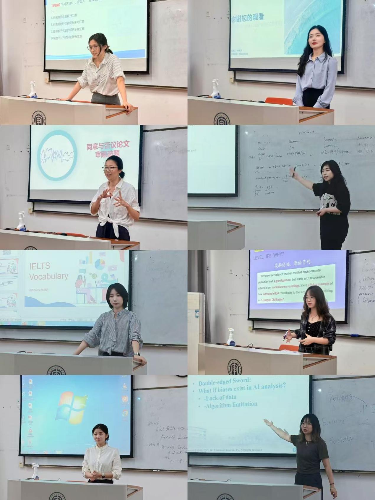 展示过程中,各位青年教师依次登台,在20分钟的时间内进行了精彩的教学片段展示。课程内容选题广泛,充分体现了国际教育的前沿性与交叉性,并普遍融入了AI辅助工具、双语互动课件、跨文化案例研讨等创新元素,展现了学院教师积极探索智慧教学、深耕双语课堂的专业素养与创新精神。每位教师展示结束后,评审小组均从教学目标契合度、教学环节设计、双语表达流畅度、教学特色创新性等维度进行了现场点评与打分。
